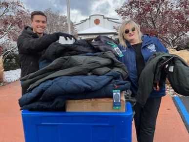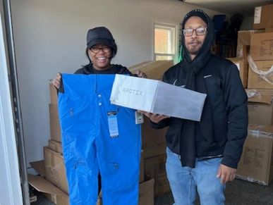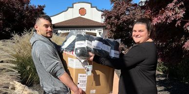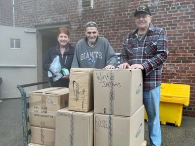 Brand new North Face coats, winter hats, sherpa blankets, ceramic coffee mugs, stainless steel tumblers, etc. hand-delivered by Vietnam Veteran Joseph Doll, and his lovely wife Harriette. Also pictured, our buddy Gary.