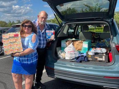 Ms. Candy and Kit Turner (a USAF veteran) from New Hope 4 Veterans Village accepting new clothing, toiletries, and food donations from our annual, “Feed Our Heroes,” Easter drive.